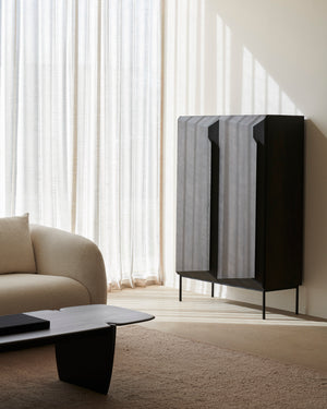Imaginé par Alain van Havre, cette armoire Stairs revendique une composition très angulaire, qui s'éloigne délibérément des surfaces traditionnelles, statiques et immuables.