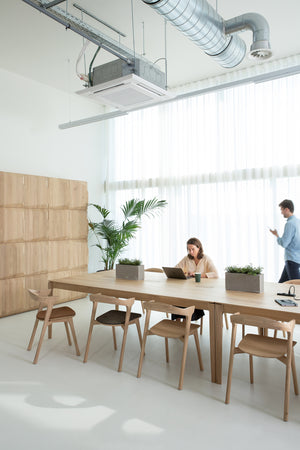 La table de coworking Bok d'Alain van Havre est parfait pour un espace de coworking. Sa conception, plus large, permet à deux personnes de s'asseoir l'une en face de l'autre tout en disposant, chacune, d’un vaste espace pour travailler. Trois séries de prises de courant sont intégrées à la table. Une fois que vous avez terminé, vous pouvez renfoncer les prises dans la table, de manière à ce qu’elles ne dépassent plus de sa surface lisse.