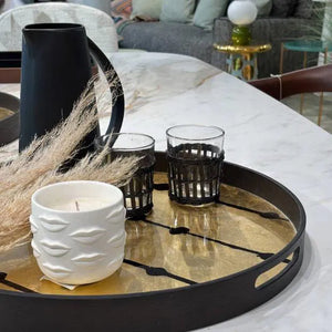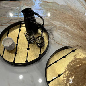 Expérimentant le concept de dualité, la collection de plateaux Gold Leaf Dots capture l'éclat doré du soleil à l'aube et les lueurs du crépuscule.