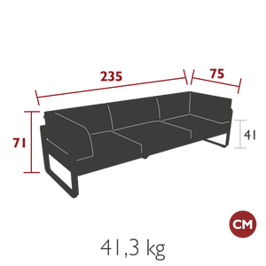 Ce canapé d’extérieur en aluminium, aux dimensions généreuses, s'avère idéal pour tous les âges et tous les gabarits. Il vous accueille, vous + votre conjoint + vos 2 enfants, vous + vos meilleurs amis et votre chien… Complétez la liste des possibilités : la composition des combinaisons est infinie ! Trois personnes peuvent être confortablement installées côte à côte et… jusqu’à 6 personnes (un peu) plus serrées ! Le canapé Bellevie a la douceur et l’allure d’un canapé de salon grâce à la douceur et la qualité du tissu Sunbrella 100% outdoor développé en exclusivité pour Fermob par Dickson, leader mondial du textile d’extérieur. À ce toucher velouté s’ajoutent de véritables performances techniques : déperlance, résistance aux UV, aux taches, aux moisissures... Et pour protéger votre canapé des fortes pluies, pensez à l’habiller d’une housse déperlante spécialement conçue pour lui !