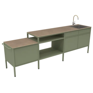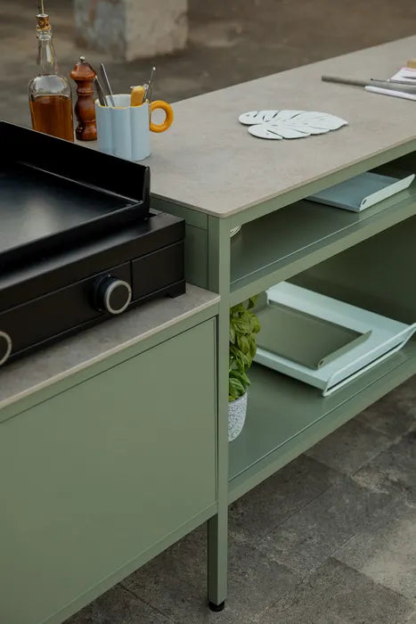 La Généreuse est la version grand format de la collection GOOSTO de Fermob : une cuisine d'extérieur spacieuse et accueillante, dotée de différents types de rangements.