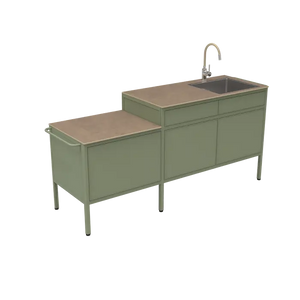 Avec seulement 190 cm de longueur, elle concentre l'essentiel : évier, plan de travail, support de plancha, tiroir, rangements fermés et même porte ustensiles !