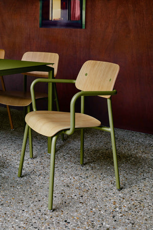 La nouvelle chaise Studie pour l'intérieur de chez Fermob - Assise et dossier en chêne, structure en Aluminium. idéal pour votre cuisine, un coin bureau. Disponible à Liège, A l'Est d'Eden.