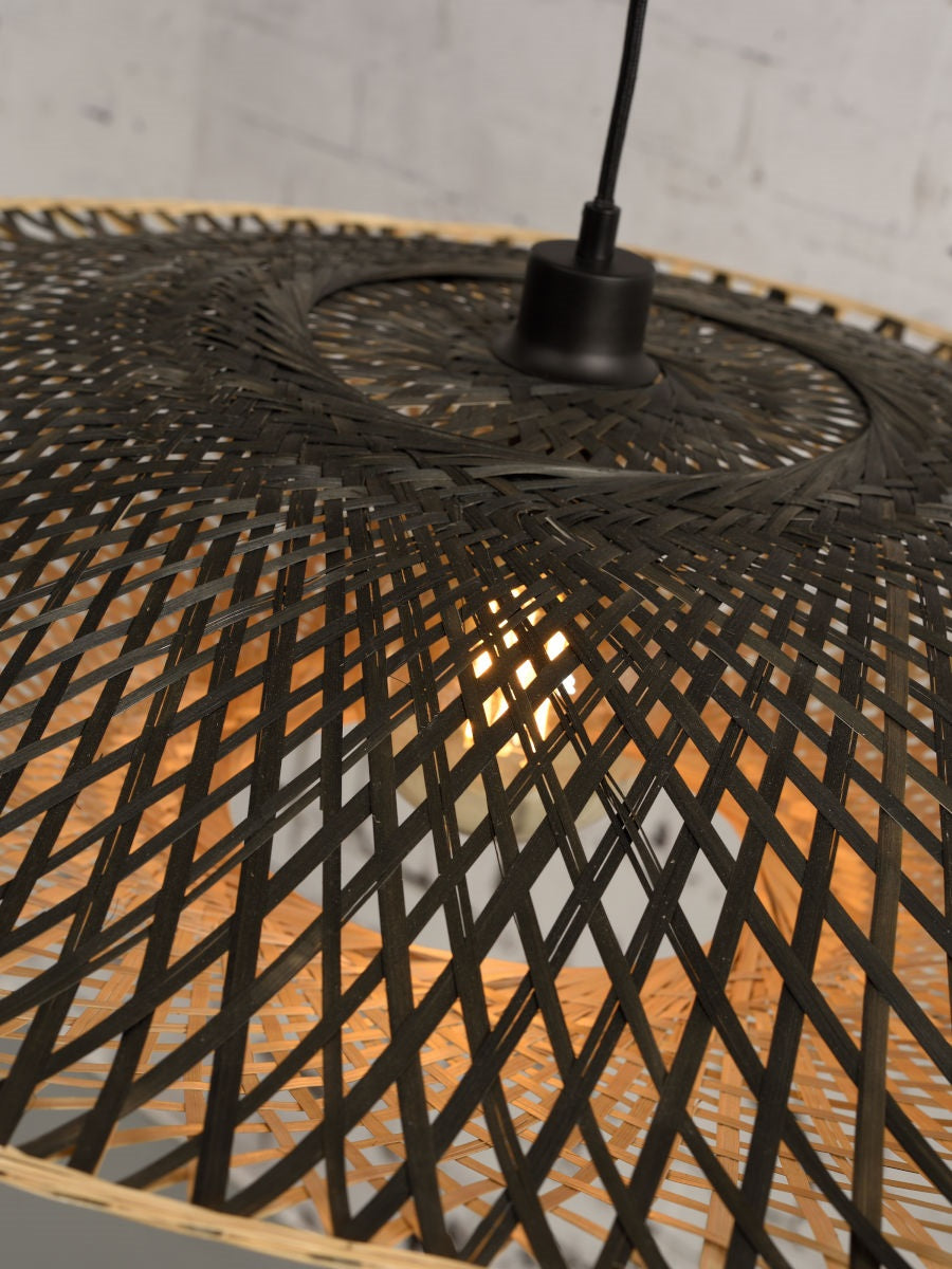 La Lampe sur Pied Kalimantan de la collection GOOD&MOJO. Diamètre 87 x H.20. Hauteur 218. Cable 2,2 mètres. En bambou. Disponible à Liège, à l'Est d'Eden.