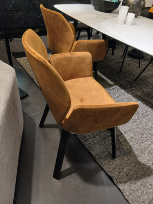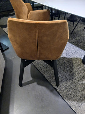 Lot de Six chaises Mood 95 de Mobitec avec accoudoirs en tissu Genova Cognac et pieds chêne noir, plateau tournant.