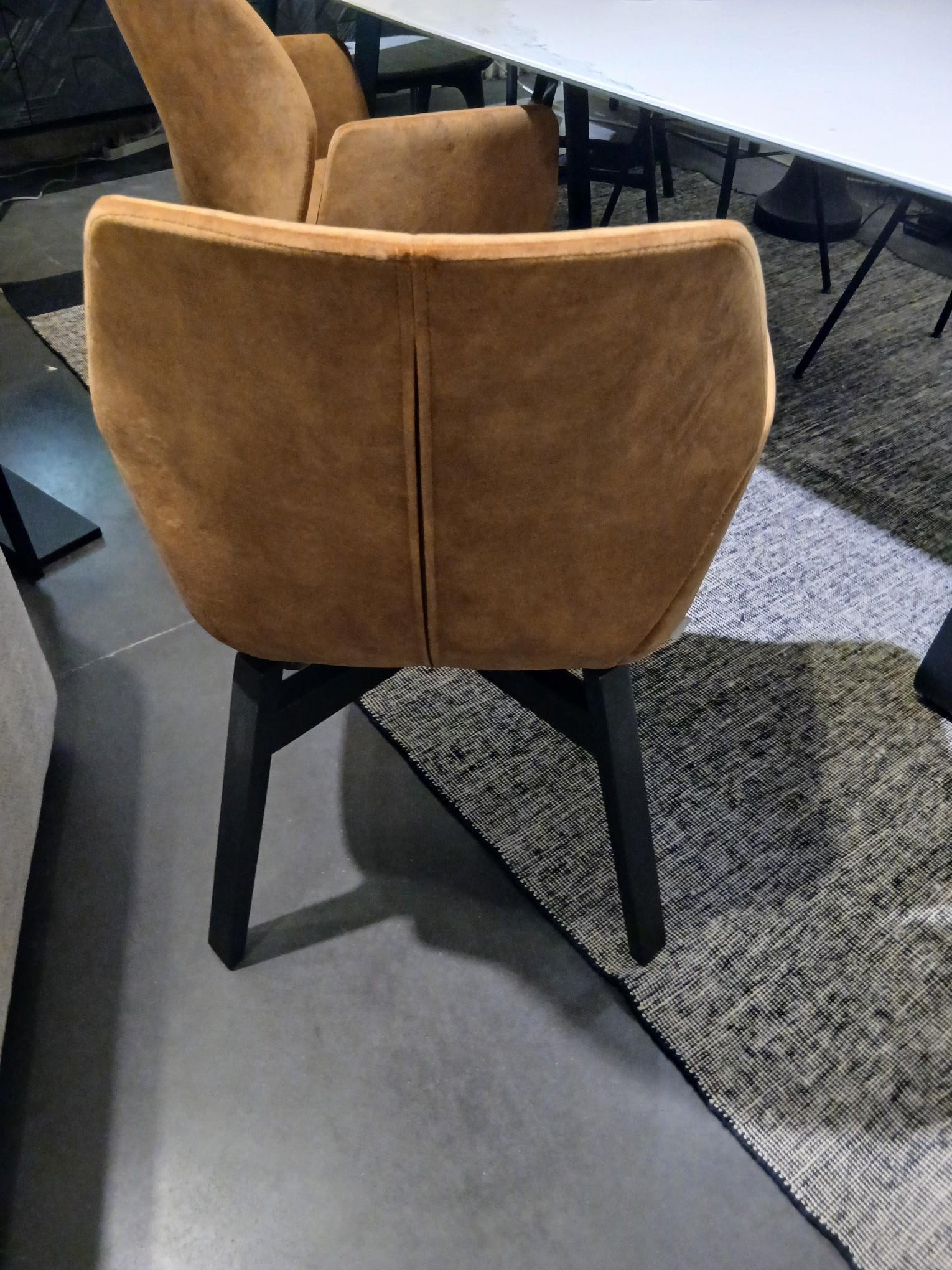 Le prix est celui d'un lot de Six chaises avec accoudoirs et plateau tournant en tissu Genova Cognac et pieds chêne noir.