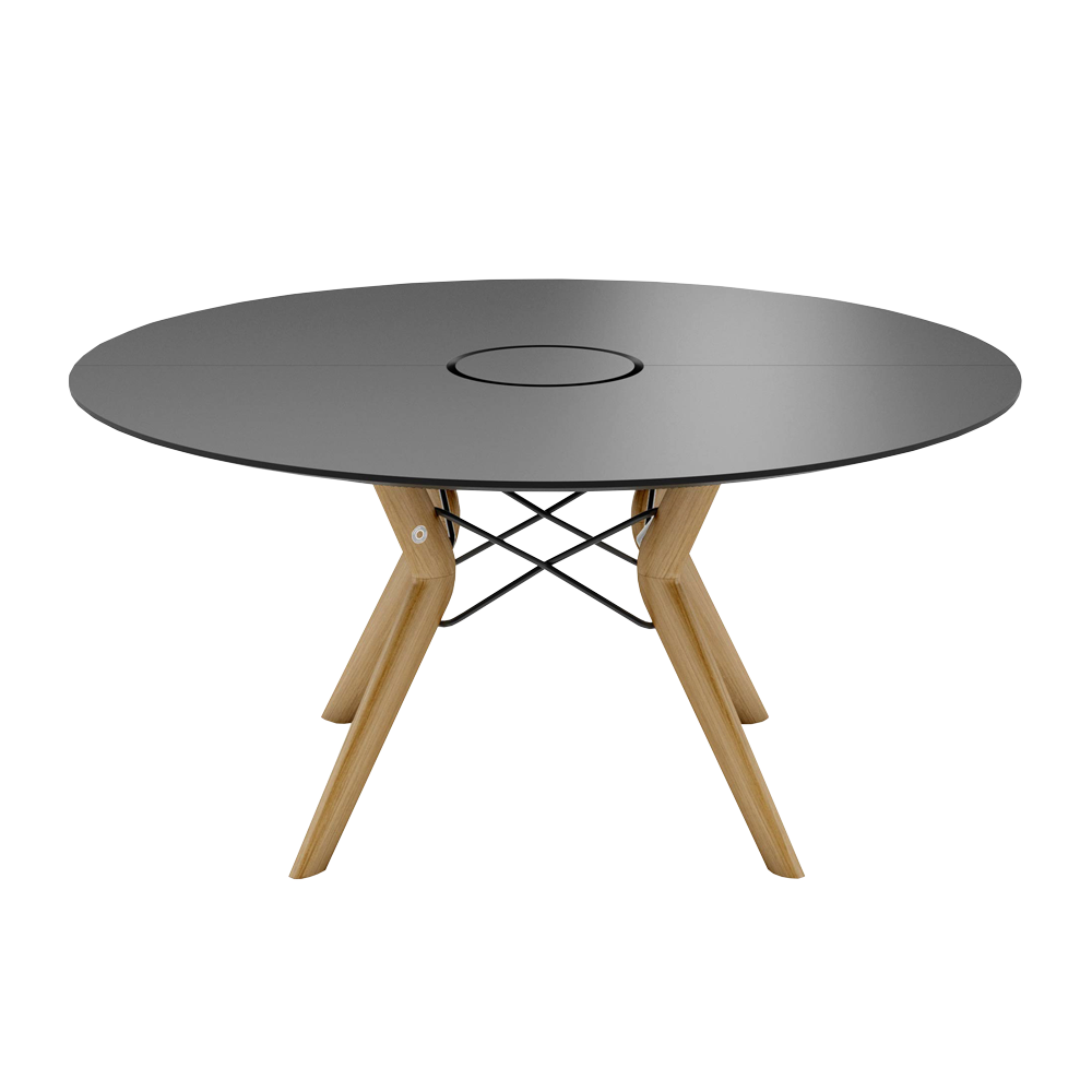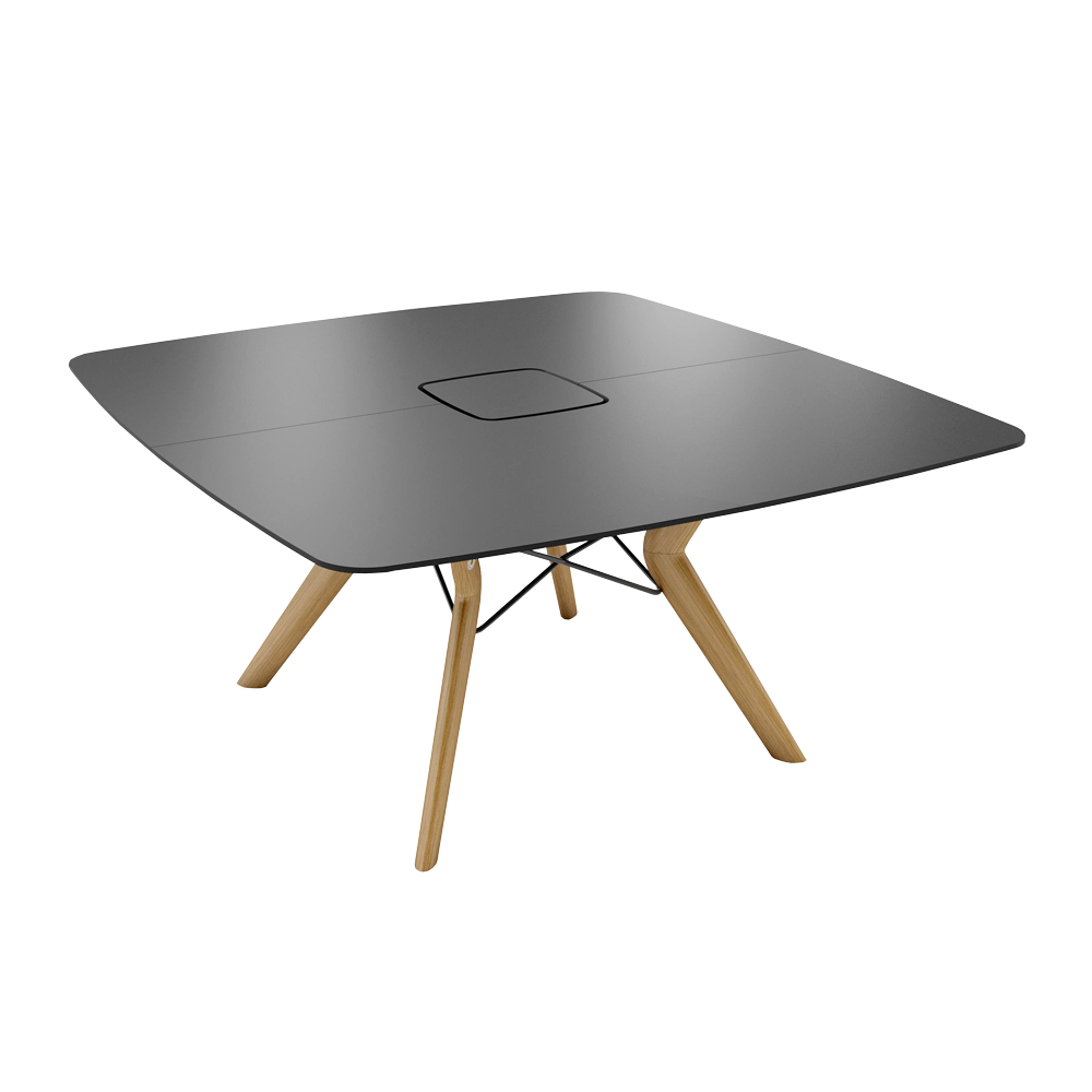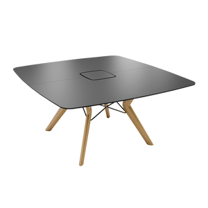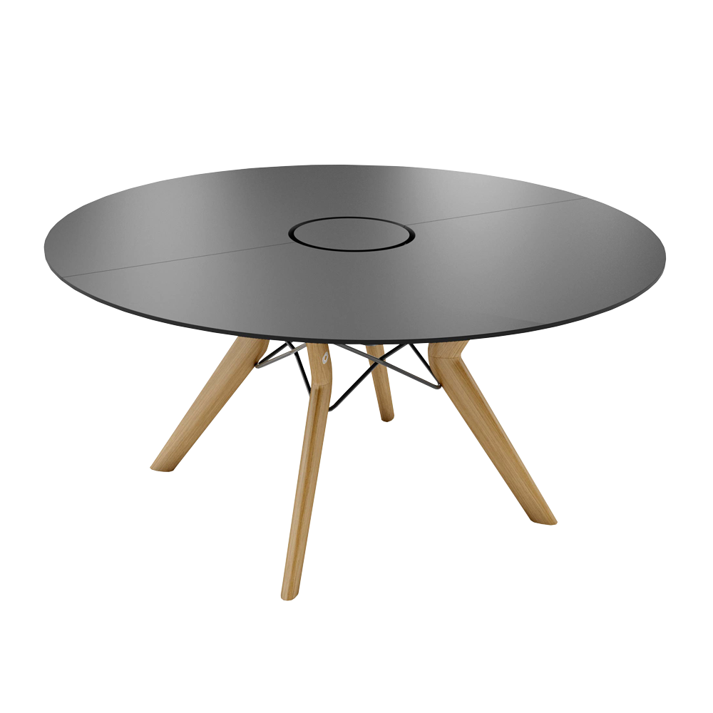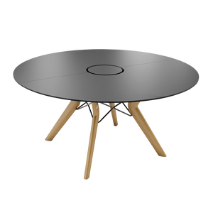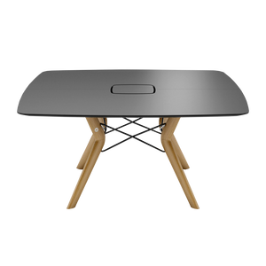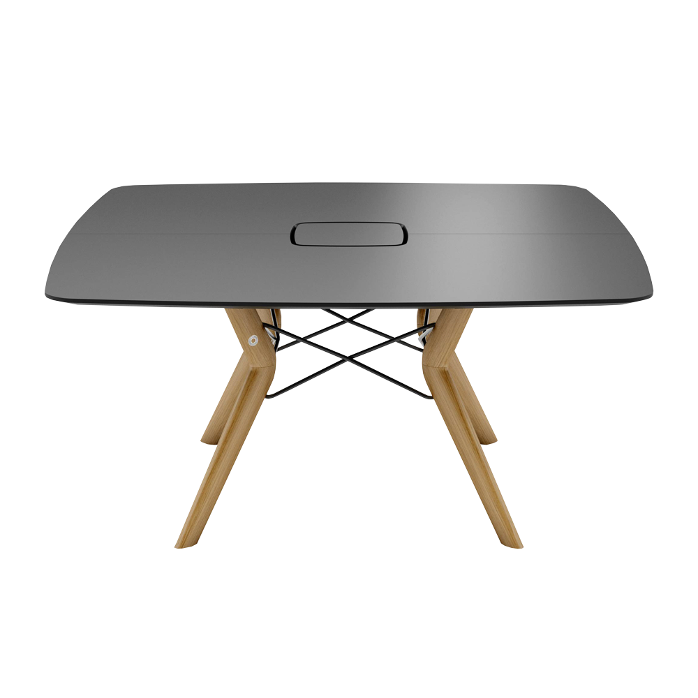 La table TRAVA en FENIX NTM© ou plateau Bois massif présente un branchement Bachmann au centre