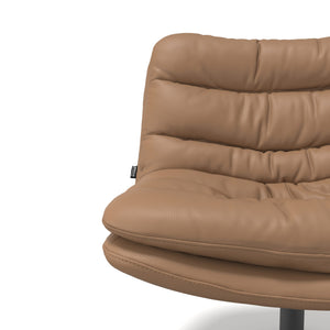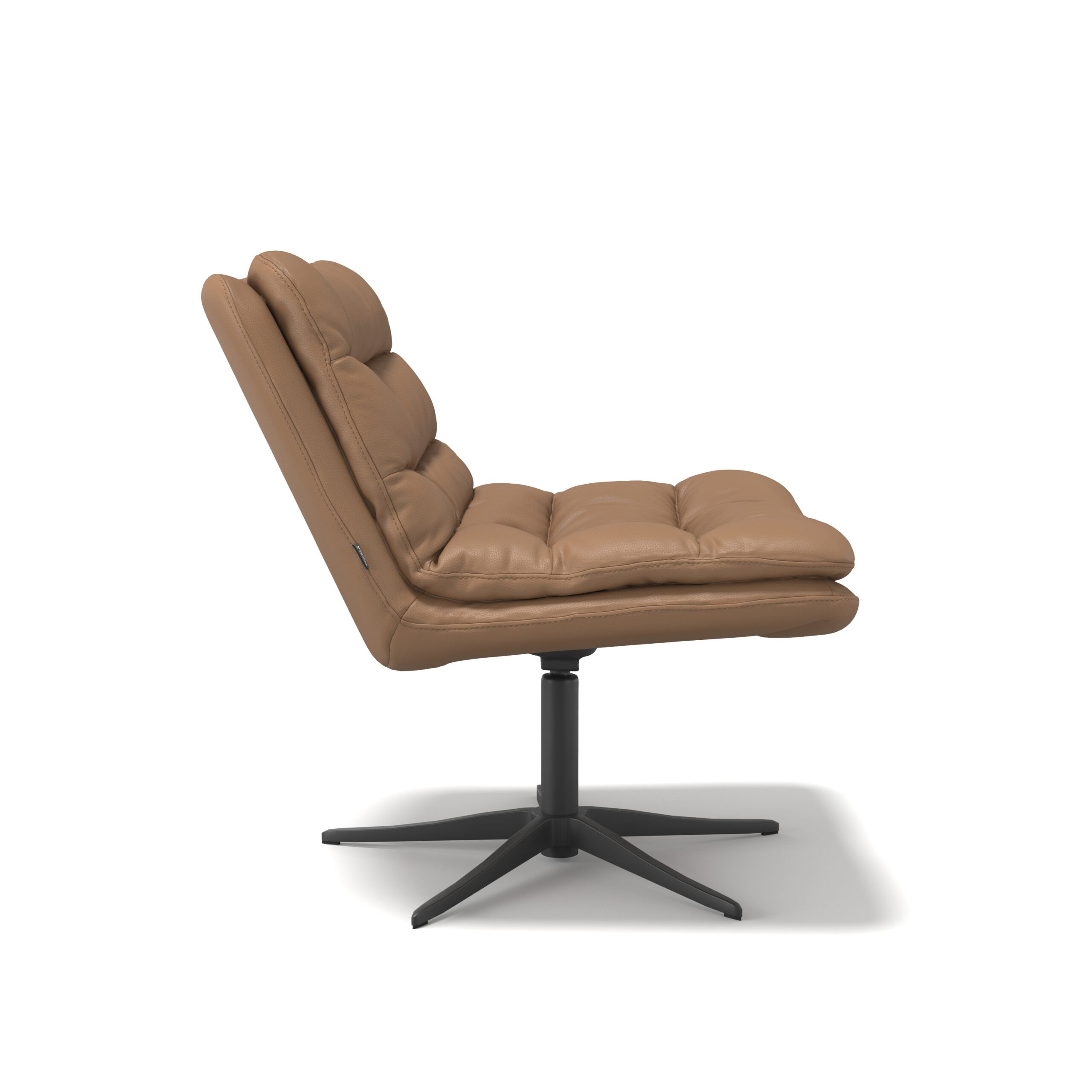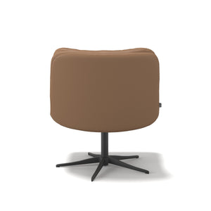 Doté d'un pivot à 360° avec retour automatique et d'une assise et d'un dossier garnis de plumes, ce fauteuil est également disponible avec un dossier bas et un repose-pieds assorti pour une détente optimale.
