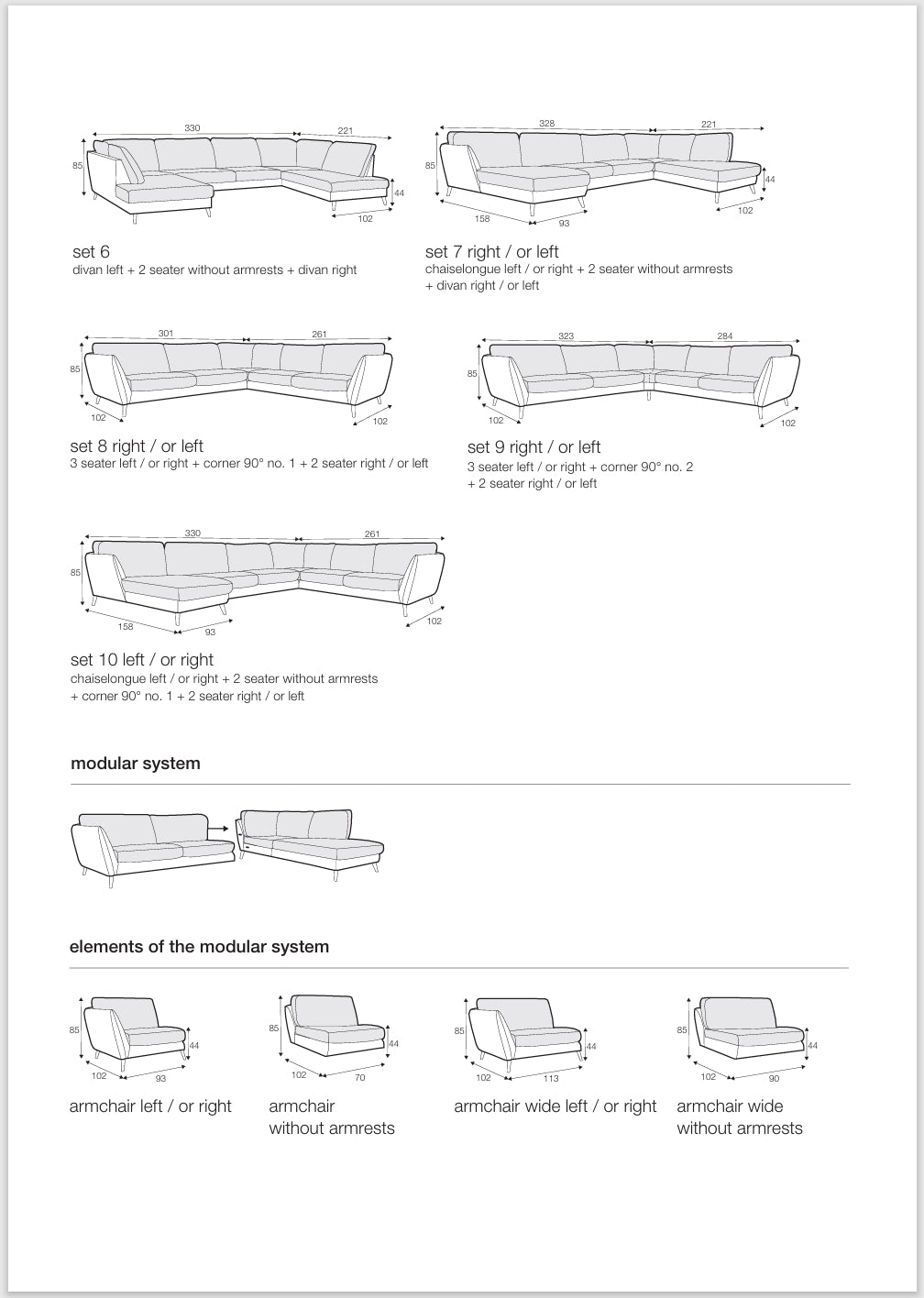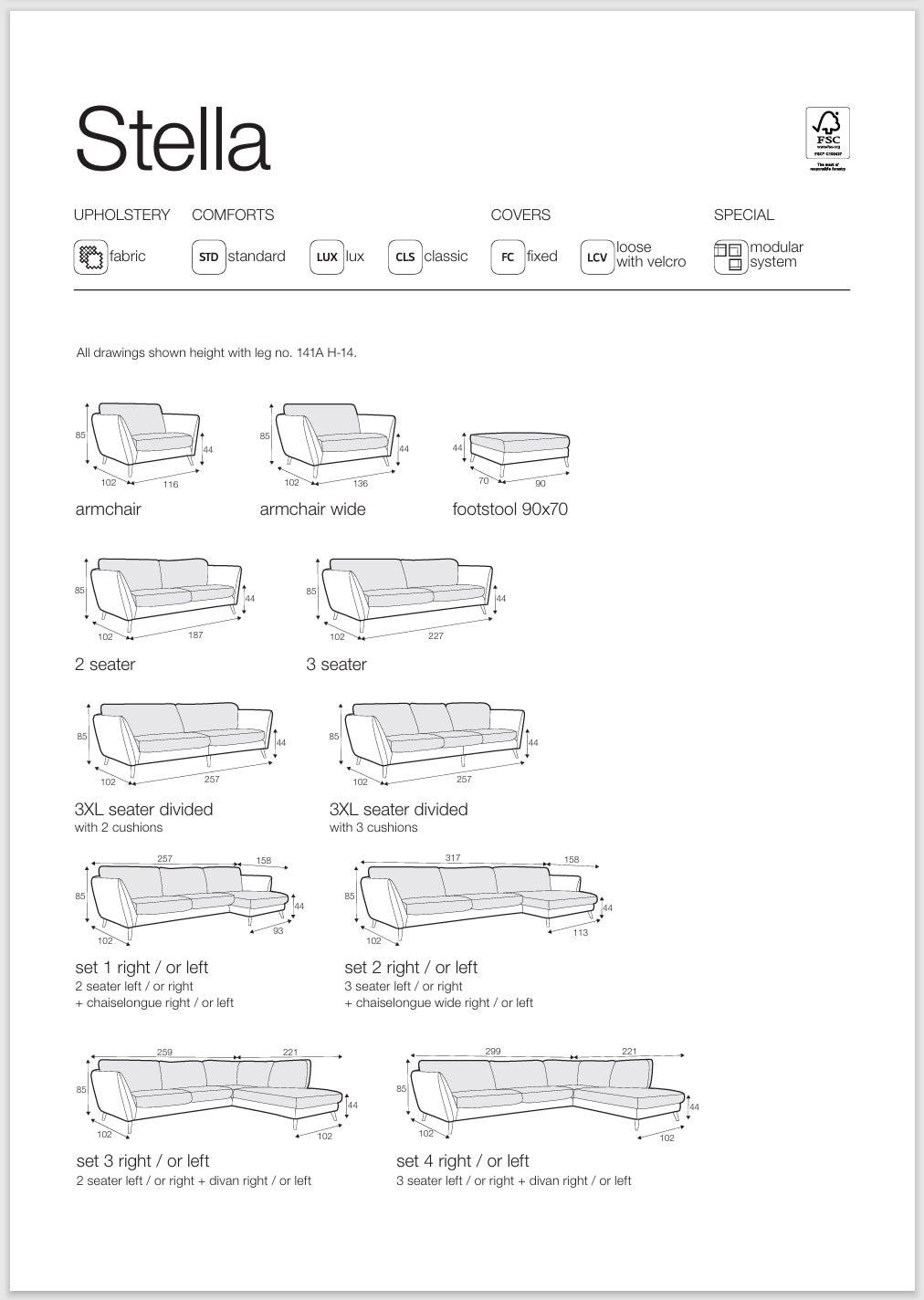 LA GAMME STELLA : 2 fauteuils, canapés 2 ou 3 places, de nombreux modules pour composer votre canapé sur-mesure, 10 sets pré-composés. Pour en savoir plus, consultez ou téléchargez la fiche technique.