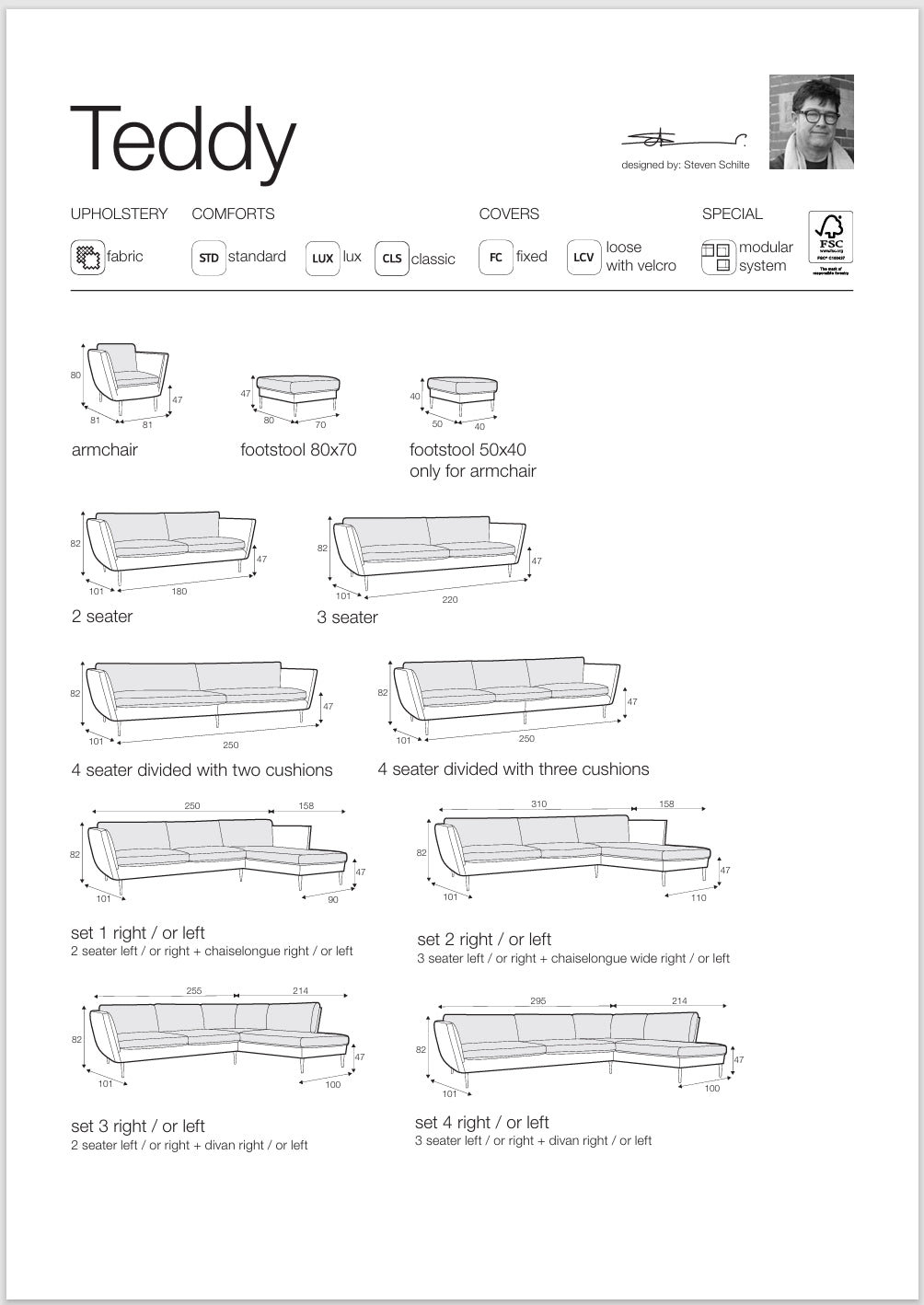 Le confort a-t-il déjà été meilleur ? La courtepointe distinctive qui recouvre l'assise, les accoudoirs et les coussins du Teddy est une invitation au plaisir. Personnalisez le canapé ou le fauteuil selon vos goûts en choisissant des pieds en bois ou en métal, confort standard ou luxe et votre type de revêtement (fixe ou lâche avec velcro).