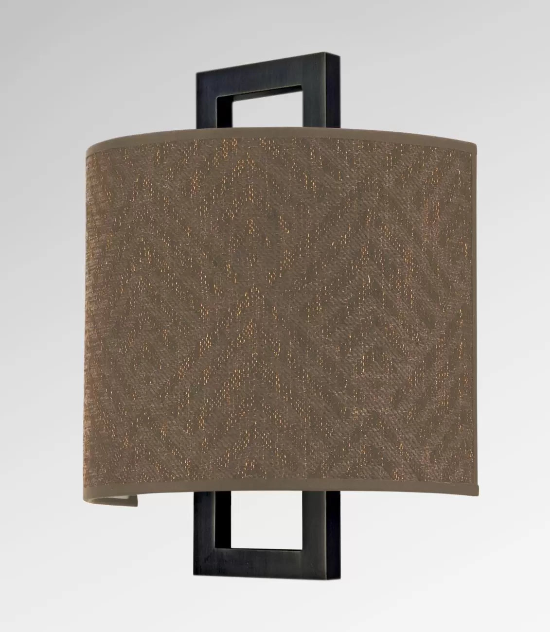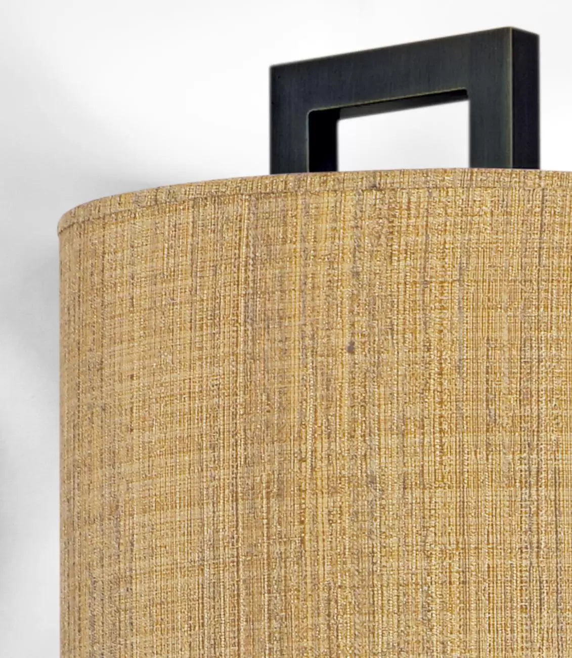 L'abat-jour semble suspendu devant une structure rectangulaire en laiton.