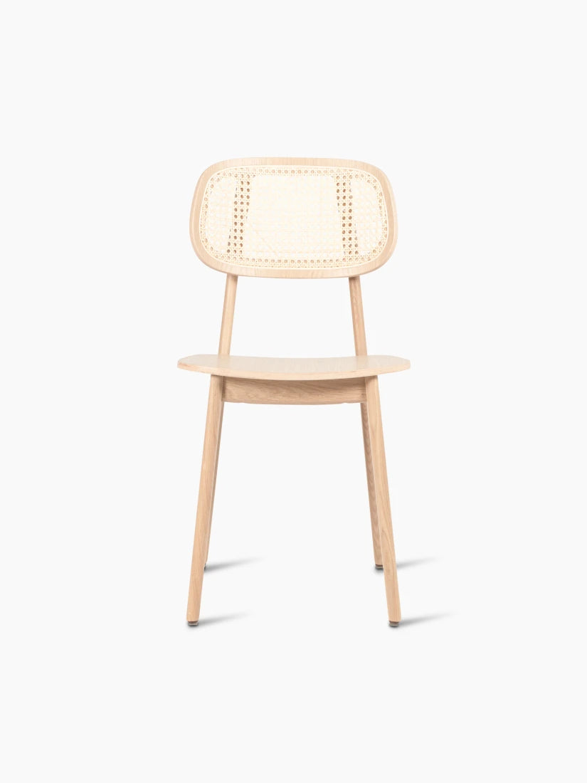 Une chaise de salle à manger raffinée avec un beau tissage en rotin, une structure en chêne massif et une assise moelleuse.