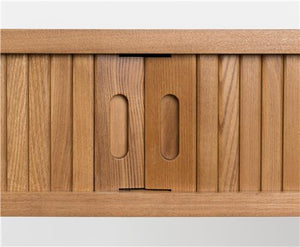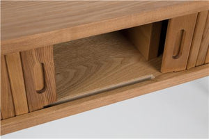 La console Barbier de la marque Zuiver : Haut et bas en MDF avec placage de frêne, panneaux intérieurs en MDF avec feuille, pieds et tambour en bois de frêne massif.