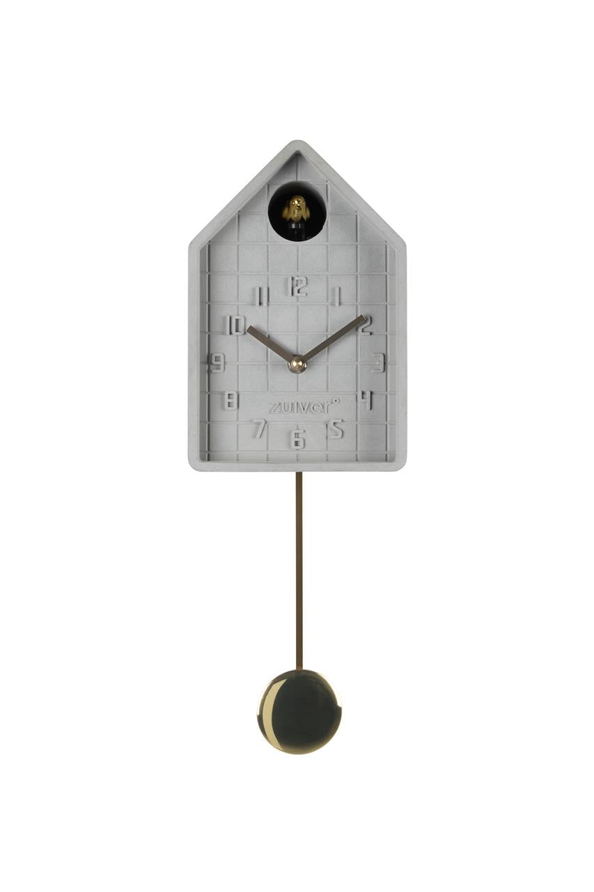 Dans la collection Zuiver, l'horloge Lori est fabriquée à la main en béton avec un motif 3D élégant et un oiseau et un pendule de couleur or brillant.