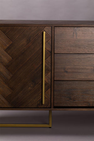 La chaleur du placage en bois d'acacia finition noyer se marie parfaitement avec l'élégante base en laiton. Ensemble, les matériaux confèrent un look haut de gamme, qui ajoute immédiatement une atmosphère à n'importe quelle pièce. Le motif à chevrons incrusté donne également au meuble une touche unique.