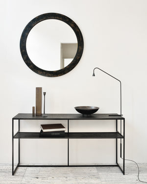 Positionnée légèrement en retrait, l'étagère inférieure se conjugue à l'épaisseur du plateau pour créer un contraste graphique avec sa base largement ouverte. Ses lignes simples et sa hauteur standardisée permettent de révéler la beauté épurée du métal bien ouvragé.