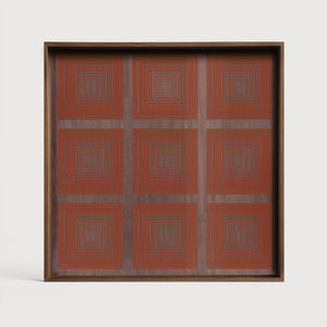 Le mouvement organique rencontre les formes linéaires dans la collection Ethnicraft de plateaux Linear Flow. Ce plateau en verre Pumpkin Squares s'inspire des dessins à l'encre réalisés au début du processus de conception ; lorsque le pigment entre en contact avec le verre, il prend vie de façon remarquable. Les effets complémentaires se révèlent de manière inattendue, où  les motifs linéaires dessinés et peints à la main créent une finition caractéristique.