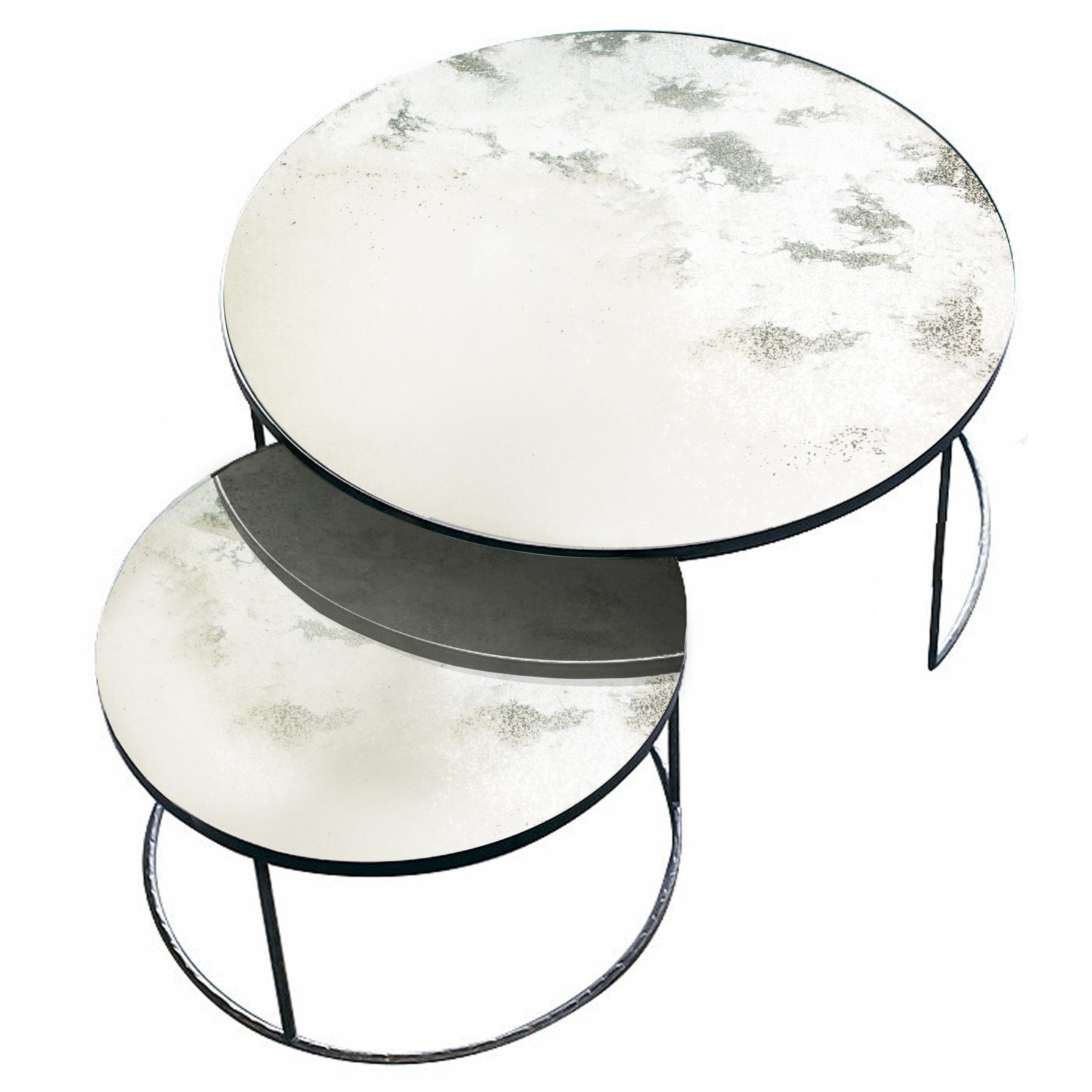 Ensemble de tables basses gigognes rondes en miroir vieilli - 2 pièces.